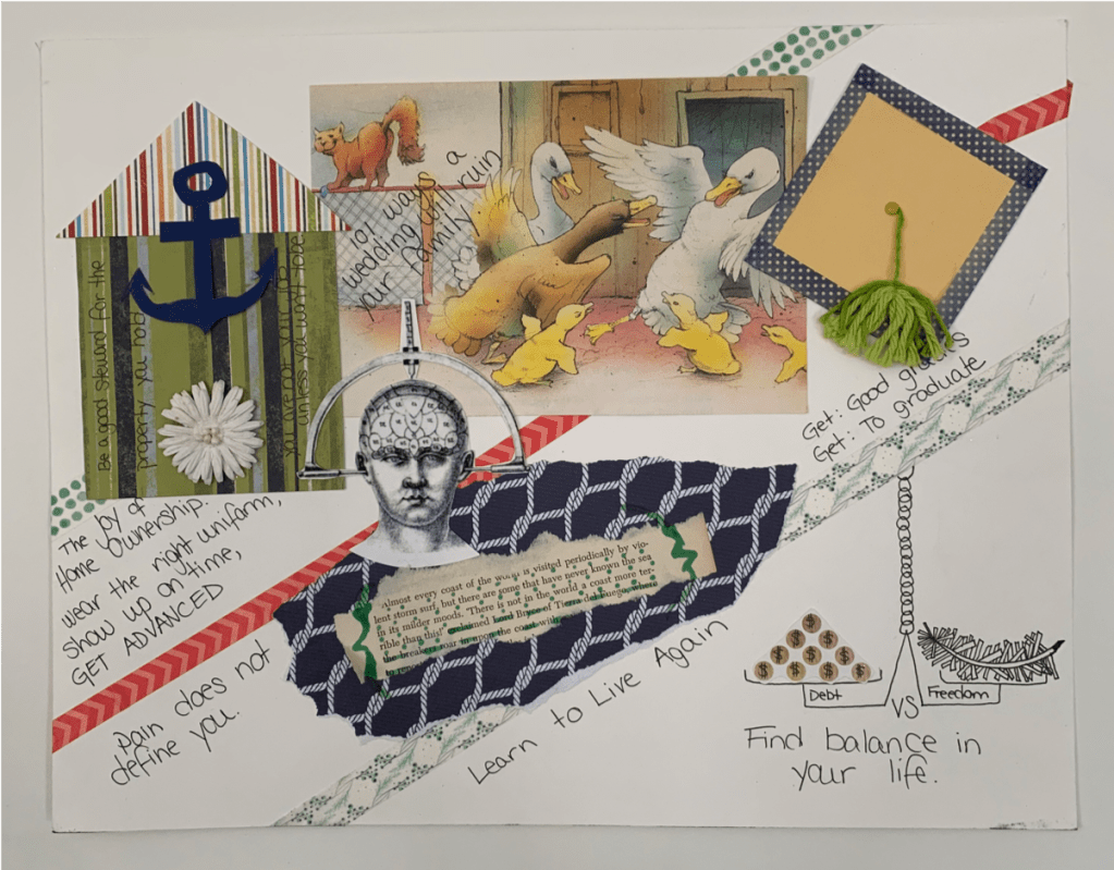 Goals: Past, Present and Future, 2018 11” X 14” Mixed Media Collage, paper, fiber, ink Intro to Art Therapy